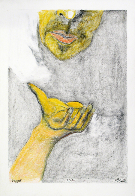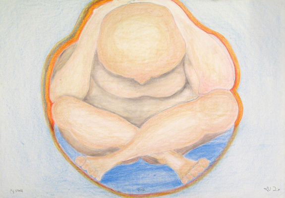 His conceptual tendencies allow his work to be much more abstracted than what is commonly identified as Inuit art. With My Shell and Beggar Toonoo lends his talent to images that appear modern in any sense. His blending of the colours and experimentation with the composition allows him to develop his own style of exploring both the medium and his own abilities. In My Shell Toonoo explains that “this drawing began with a circle, which reminded me of the shape of a uterus. So I drew myself inside”. This study of external and internal anatomy together lends itself to a dissection of composition and form that shows elements of experimentation and experience with the medium.